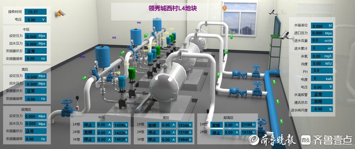 而在濟南水務集團二級供水監(jiān)控中心內(nèi),大屏上正實時顯示每個二次泵站小區(qū)設備運行情況,值班人員時刻通過平臺查看設備電壓、用電量、進出廠壓力、水箱液位是否處于良好狀態(tài)。而這僅是智慧水務信息收集與檢測的一個縮影。