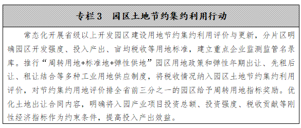 保障產業(yè)園區(qū)用地需求。推行“周轉用地+標準地+彈性供地”產業(yè)園區(qū)用地政策,根據產業(yè)園區(qū)近三年平均供地水平,分類預安排新增建設用地周轉指標。推行彈性年期出讓、先租后讓、租讓結合等多種工業(yè)用地供應制度,降低工業(yè)企業(yè)用地成本,更好服務產業(yè)發(fā)展。