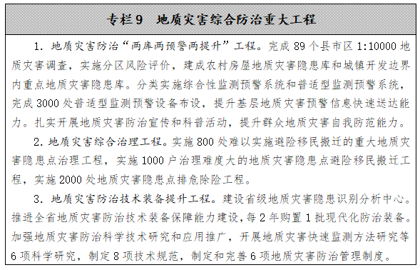 健全完善地質災害防治技術標準和制度體系。編制地質災害調查評價、監(jiān)測預警、工程治理、風險管控等技術要求和標準規(guī)范,形成符合我省實際的地質災害防治標準體系。健全地質災害危險性評估、農民建房地質災害風險簡易評估等相關制度,形成完善的地質災害防治制度體系。
