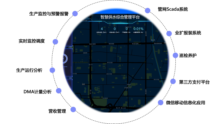 取水分析、消耗產出、水質分析、水壓分析、運營分析、設備統計