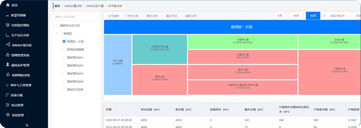 利用DMA分區方式,對劃定區域的水量輸入輸出情況進行監控。結合生產運行情況,分析得出該區域的產銷差數據。從而有針對性地降低漏損率,提高整體經營水平。 可自主進行DMA分區設置。只要選定的區域有相對獨立的輸入與輸出,即可劃定為DMA分析區域。DMA分區可以是某個社區,也可以是一定區域的管網。 將區域內的計量設備進行輸入輸出綁定后,即可對該區域進行計量分析監控。分析得出該區域的產銷差數據。從而有針對性地判斷該區域運營情況,降低漏失率。